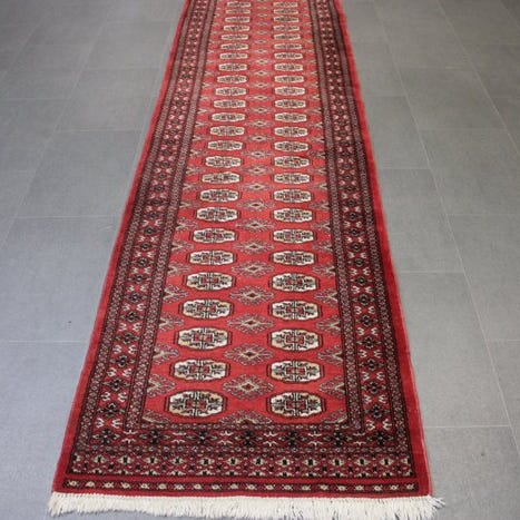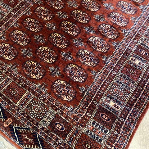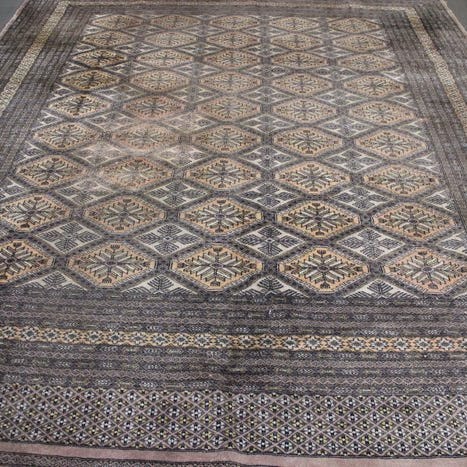 Model Buchara, oprindelsesland Pakistan, håndknyttet tæppe af uld på bomuld, 348 x 255 cm, farverne orange og brun, fra afslutningen af det 20. århundrede. Klik på den blå "gå til varen" knap, for at købe eller byde på denne vare. Den samlede pris vil blive vist inden du afgiver dit bud.