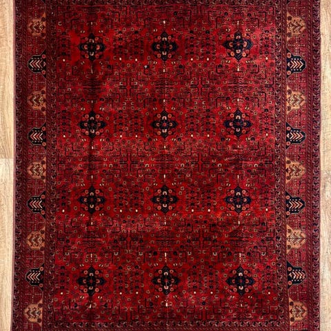 Dette håndvævede orientteppe i det klassiske afghanske design viser et traditionelt, geometrisk opbygget mønster med regelmæssigt anbragte Gül-motiver.