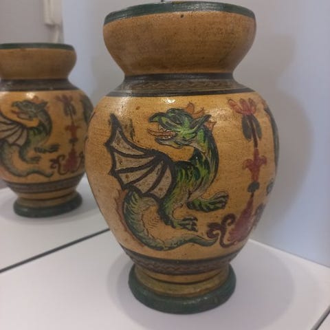 To håndmalede Deruta Majolica vægvase fra Umbrien, Italien, fremstillet af ARS Assisi, ca. 1960–1970, i god brugt stand med let aldringsmærker, hver måler 19 cm i højden, 9 cm i bredden og 5 cm i dybden og vejer 400 g. Klik på den blå "gå til varen" knap, for at købe eller byde på denne vare. Den samlede pris vil blive vist inden du afgiver dit bud.