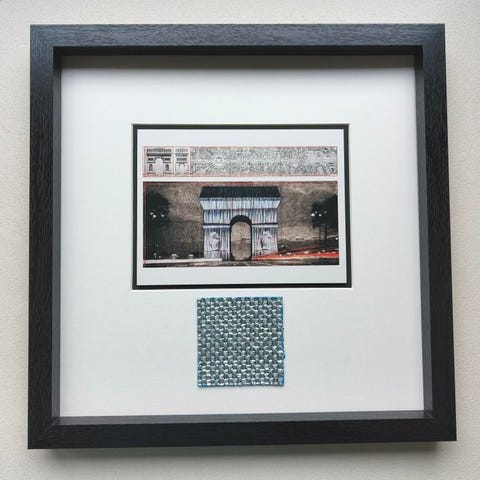 Eksklusiv indrammet kunstprint "L'Arc de Triomphe, enveloppée - Paris 1961-2021" med originalt stofkvadrat (blå polypropylénfibre med sprøjtet aluminiumstof).