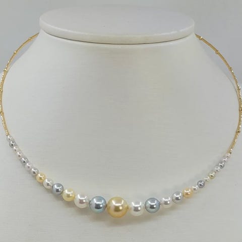 Produceret i Japans varme have, blev perlerne håndudvalgt for deres naturligt levende hvide, gyldne og sølvfarvede farver og rig luksuriøs glans.
