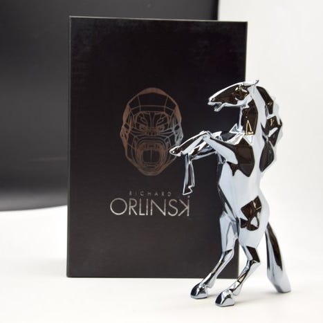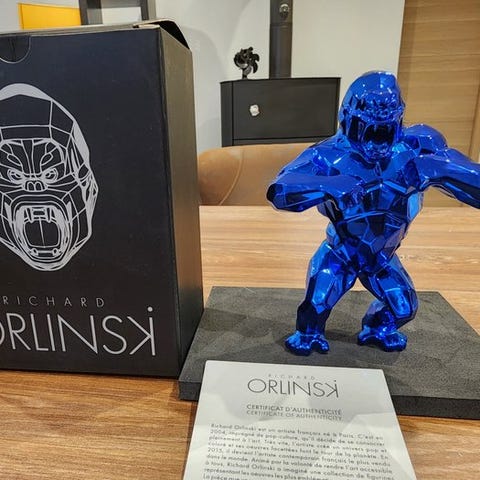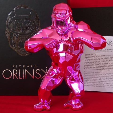 Chrome Olympia Kong, en 2019 resin skulptur af den franske kunstner Richard Orlinski, 13 cm høj og 10 cm bred, usigneret, i en contemporain stil, sølvfarvet, edition Chrome Olympia, med ægthedscertifikat, beskrevet som ekstremt sjælden og med synlige fabrikationsfejl og blå pletter. Klik på den blå "gå til varen" knap, for at købe eller byde på denne vare. Den samlede pris vil blive vist inden du afgiver dit bud.
