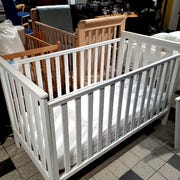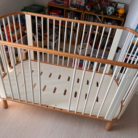 Vintage stor baby seng i kurve flet og på støbejern stativ. Mål: 47 x 87 ligge mål 30h. 70h støbejern stativ 400kr. Fagus dansk design robust stol 34 sidde højde 175kr stk.