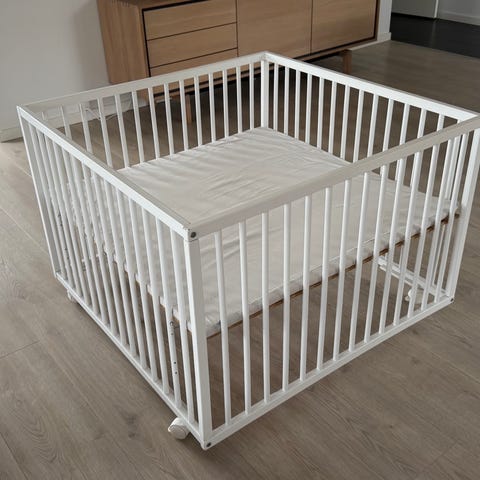 1x1 m hvid kravlegård med to højdeindstillinger og låsbare hjul.