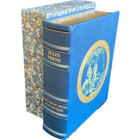 Plein skyvertex bleu nuit, dos à 2 faux nerfs orné de motifs marins à froid, auteur, titre et tomaison frappés or, plats encadrés de filets dorés et d’une frise de motifs marins à froid et
