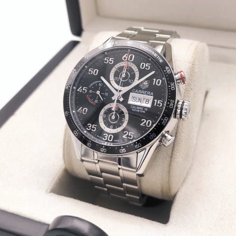 TAG Heuer Carrera Calibre Heuer 02 reference CBG2A91.FT6173, automatisk herreur i rustfrit stål til mænd, periode 2010–2020, 45 mm urkasse, sort skeletdial, stållænke, meget god stand og inkluderet original boks og papirer. Klik på den blå "gå til varen" knap, for at købe eller byde på denne vare. Den samlede pris vil blive vist inden du afgiver dit bud.