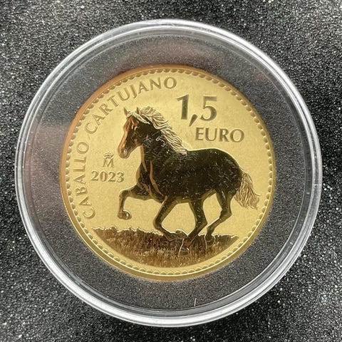 Real Casa de la Moneda udgiver i 2025 en guldmønt på 1 troy-ounce med billedet, på bagsiden, af et andet repræsentativt dyr fra Spanien, i dette tilfælde en brunbjørn (Ursus arctos). Den Cantabriske eller Iberiske brunbjørn (Ursus arctos pyrenaicus) udgør en del af en eurasiatisk brunbjørnebestand, der lever i Cantabriske fjelde, den er opført på Rødliste over truede arter og i Europa figurerer den i Den Europæiske Evaluering af pattedyr som kritisk truet. I 2020 estimerede Fundación Oso Pardo det samlede antal til omkring 370 Cantabriske brunbjørne, i håbet