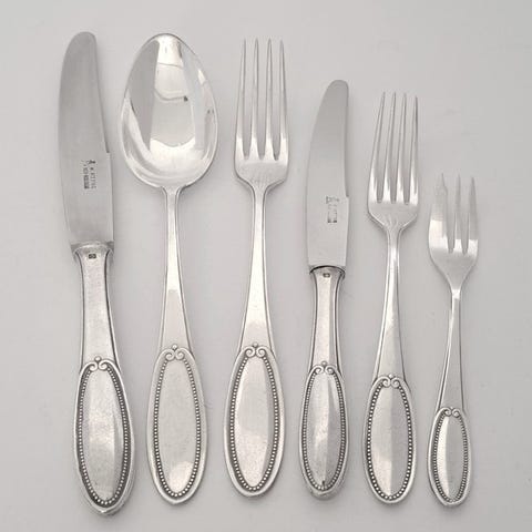 Stunning Wallace Golden Aegean Weave bestiksæt fra Wallace Silversmiths (USA), fremstillet i sølvplet med elegante kurvvævede håndtag med 24K gyldne accenter. Introduceret i 1971, dette tidløse mønster har et luksuriøst, Middelhavs-inspireret design.