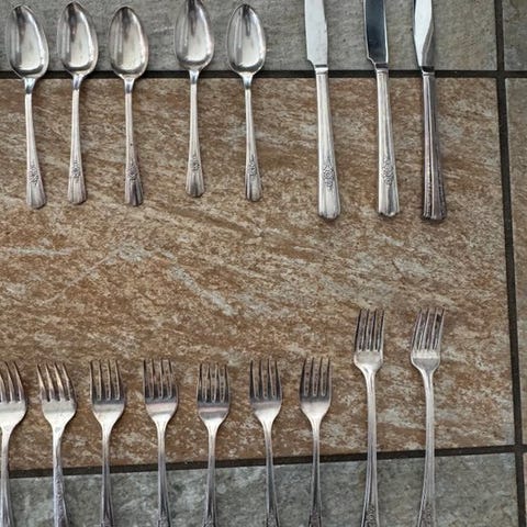 Denne smukke bestikservice i sølvplet fra Rogers, bestående af 21 dele, er en skat i bordets kunst.
