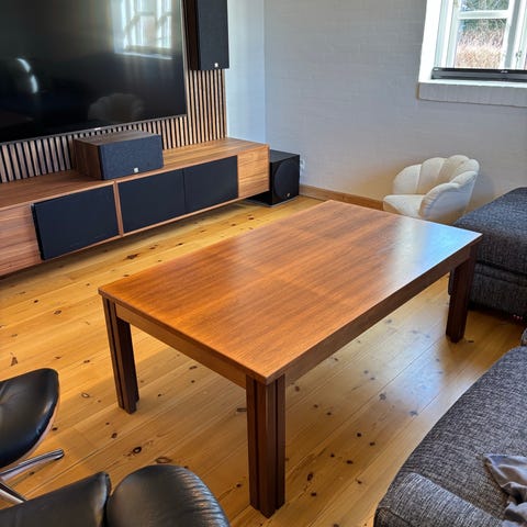 Skovby sofabord SM244EMH i hvidolieret eg, købt som ny i sommeret 2024, har altid været beskyttet af gennemsigtig voksdug, som medfølger.
