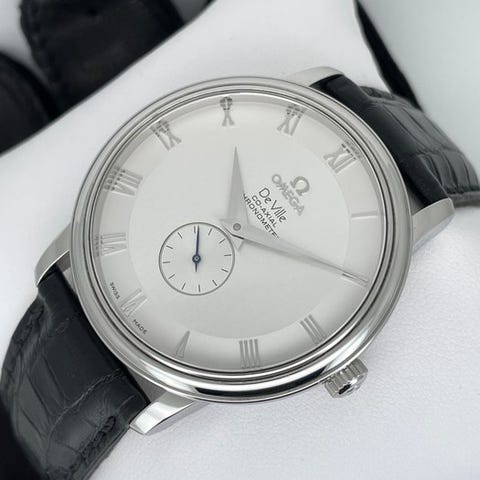 Et mesterværk af klassisk elegance, står dette De Ville Prestige Chronograph som et forfinet kapitel i Omegas arv. Mens mange associerede den legendariske Calibre 861-bevægelse udelukkende med den robuste Speedmaster Professional "Moonwatch", rummer denne reference det samme højtkvalitative, manueltværende hjerte inden for en sofistikeret og slank kjolesjekket urprofil. Den sølvglansede solburst-dial har polerede baton-indekser og tre fuldstændigt proportionerede kvadranter, og byder på et rent, monokromt æstetik. Med sin polerede rustfri stålkasse og tidløse
