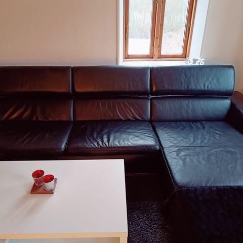 Flot sofa med chaiselong i cognacfarvet læder. Kan skilles ad i 2 for transport