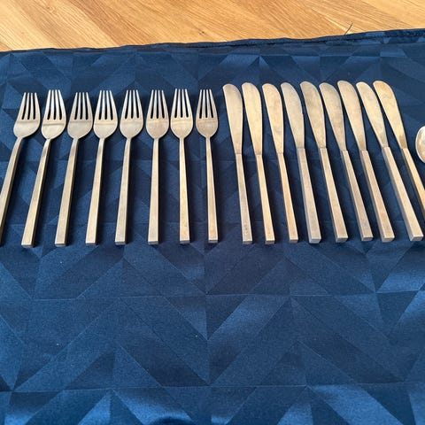 Dette komplette sæt bestik til seks personer er et fremragende eksempel på høj kvalitet håndværk og materialer. Sættet er utroligt elegant med tidløst design. Vi føler, at sættet generelt står i god original stand i originaletui.