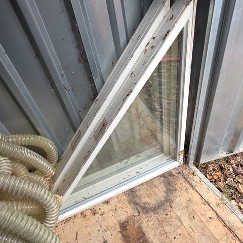 Outrup fast trekantet vindue i hvidmalet ramme. Vinduet er opdelt i tre felter med faste ruder. Mål ifølge mærkat: bredde ca. 1198 mm og højde ca. 2608 mm. Velegnet som side- eller gavlvindue, hvor der ønskes stort lysindfald uden oplukkelige rammer.