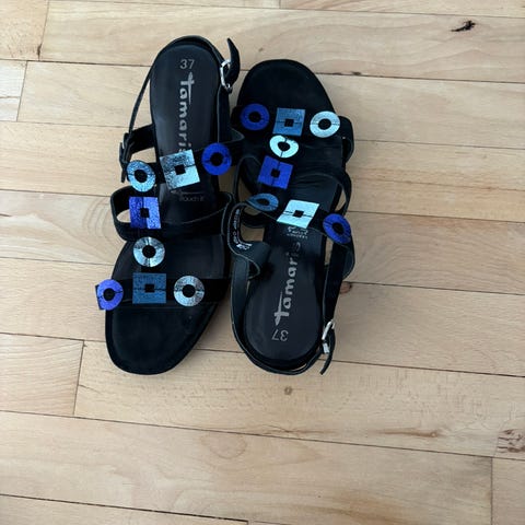 Sandalerne har brun læderoverdel med remme over forfoden i sort og lys beige. Justerbar ankelrem med lille spænde. Blokhæl 7 cm. Indersål i læder.