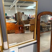 Spejlet har en gylden ramme og en rektangulær form. Det er glasskåret og klart.,Bemærk at mail, chat og beskeder ikke besvares, og varen skal købes på knappen "Gå til varen"