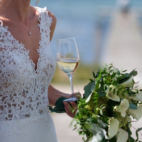 Brudekjole, Modeca, str. 34, Blonder, Næsten som ny, Rigtig fin brudekjole fra Modeca, modellen hedder Le Papillon Bibi og er købt i Brudesalonen Kennedys. Den er kun brugt én gang, og trænger til en rens, men er ellers i perfekt stand. Kjolen er en str. 34 og svarer en almindelig tøjstørrelse 36/small. Jeg er selv 168 cm høj og havde 5 cm hæle på. Kjolen har halterneck og knapper ned langs venstre side. Der er to hvide inderlag stof og to yderlag med blonder. Slæbet er ca. 1 meter langt og der er syet slæbophæng i samt bh-skåle, så den er meget komfortabel. Der medfølger dragtpose og evt. kvittering hvis det ønskes. Nyprisen er 11.500 kr. eksl. tilretning.