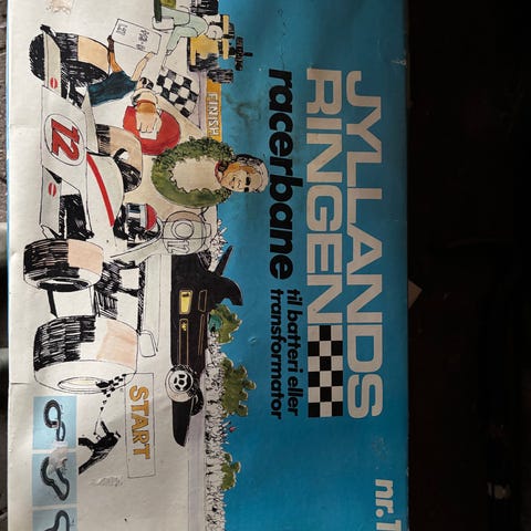 1/87 str. H0 komplet med vejbaner, autoværn, omgangstæller med tårn, bropiller, krydsspor samt 4 biler + 2 reservebiler.