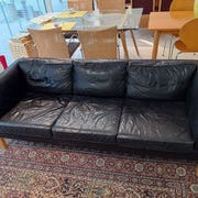 Sofaen har en ramme i lyst træ og polstring i blødt, sort læder. Den har to brede sæder. Patina og brugt men ingen skader.,Bemærk at mail, chat og beskeder ikke besvares, og varen skal købes på knappen "Gå til varen"