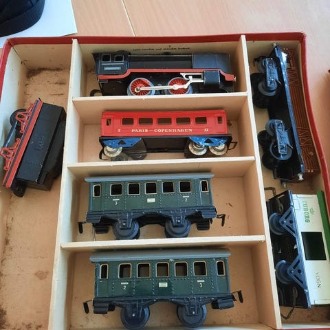 Legetøj, Model tog DISTLER, Fra start 50erne produceret i western Germany Distler blik tog med optræk i original emballage lokomotiv kan stadig trækkes op og køre alle vogne intakte orginal nøgle til optræk er med i kassen, der er 12 skinner i metal et rigtigt samlerobjekt det er ikke et tog du finder hver dag æsken er slidt