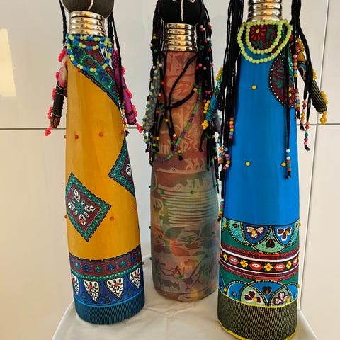 Produktet er en kunstnerisk figur i sort keramik, der forestiller en kvinde, som sidder. Hun er prydet med en halskæde af røde perler og en nederdel lavet af strå. I hånden holder hun en skål.,Bemærk at mail, chat og beskeder ikke besvares, og varen skal købes på knappen "Gå til varen"