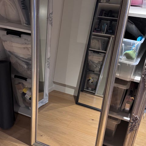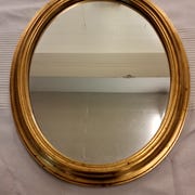 Spejlet har en oval form med en dekorativ, gylden ramme. Rammen har et bølget og mønstrede design. Glasoverfladen er glat og reflekterende.,Bemærk at mail, chat og beskeder ikke besvares, og varen skal købes på knappen "Gå til varen"