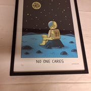Dette er et indrammet kunsttryk med en illustration af en alien i rumdragt. Baggrunden viser en planet og stjerner. Materialerne inkluderer papir til trykket og en sort ramme.