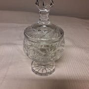 Produktet er en klar krystalglas beholder med skrå tag og dekorationer. Den har fire små ben.,Bemærk at mail, chat og beskeder ikke besvares, og varen skal købes på knappen "Gå til varen"