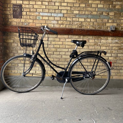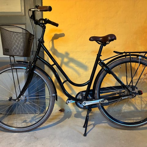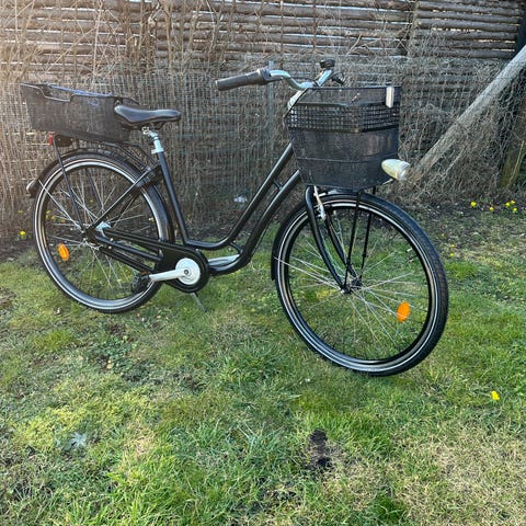 En ældre men meget velholdt sort damecykel udstyret med 3 gear, støttefod, kurv, ringeklokke, reflekser og magnetlygter.