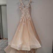 Bruden kjole har en stram top med broderi og et overdådigt draperet skørt, foruden et løst skørt. Og stiver i det ene