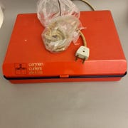 Retro Carmen Curlers De Luxe i rød æske. På sidste billede kan ses lukke klips mangler, samt lampe Skærmen er lidt smeltet,