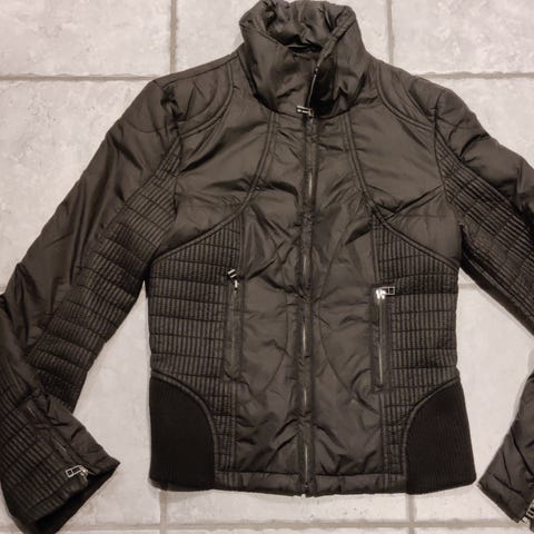 Puffer Jacket fra Vila, sort, vateret med stor krave, trykknaplukning og stiklommer. Helt som ny, købt for stor