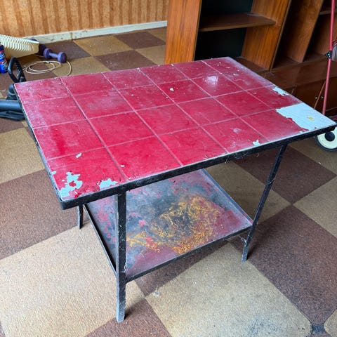 Fint gammelt vintage gasbord/køkkenbord sælges. Bordet er sat i stand og har fået nyt liv med sortmalet metalstel og en bordplade med flotte grønne kakler/fliser.