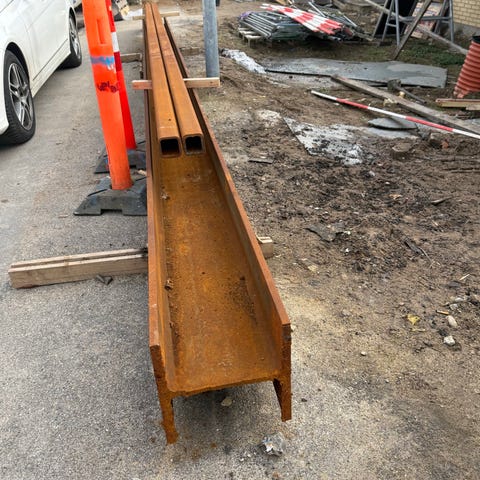 Stålprofil i form af U-bjælke. Velegnet til konstruktion, forstærkning eller andre byggeprojekter, hvor der er behov for en kraftig stålbjælke. Mål 4,91 m lang. 20 cm bred. 7,5 cm høj. Sælges som vist på billedet.