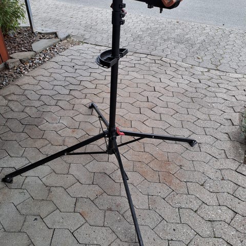 Cykel reparationsstativ med justerbart stativ i sølvfarvet metal. Stativet har trebenet fod for stabilitet og højdejusterbar midterstang. Øverste arm er udstyret med klemme til fastgørelse af cykelrammen under reparation og vedligeholdelse. Velegnet til brug i værksted, garage eller lignende, hvor cyklen skal stå stabilt under arbejde på gear, bremser og andre komponenter.