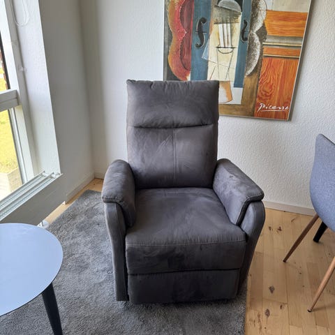Købt i januar i år. Står som ny. https://jysk.dk/stue/laenestole/laenestol-abildskov-elektrisk-graat-kunstlaeder