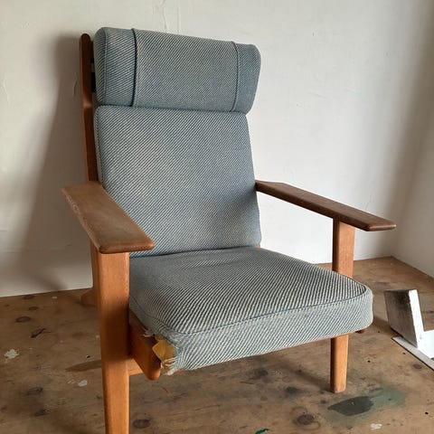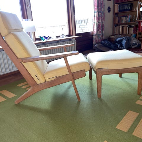 Hans J. Wegner lænestol med skammel gul polstring træstel. Model GE290A