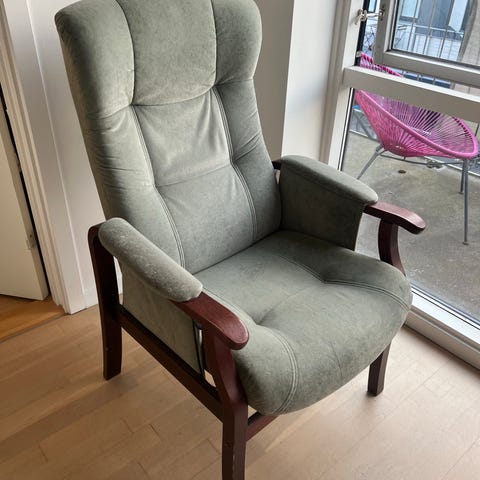 Lænestol i sort velour stof med høj ryg og polstret sæde. Stolen har træben. Egnet som læse- eller hvilestol i stue, kontor eller soveværelse.