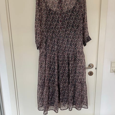 Lollys Laundry kjole til særlige lejligheder i str. S. Kjolen er i multifarvet mønster med blomsterprint og er fremstillet i polyester og underkjole i viskose. Modellen har knaplukning foroven og trekvartlange ærmer. Længden går omtrent til under knæet, afhængigt af højde. Velegnet som damekjole til særlige lejligheder eller hverdagsbrug alt efter styling.