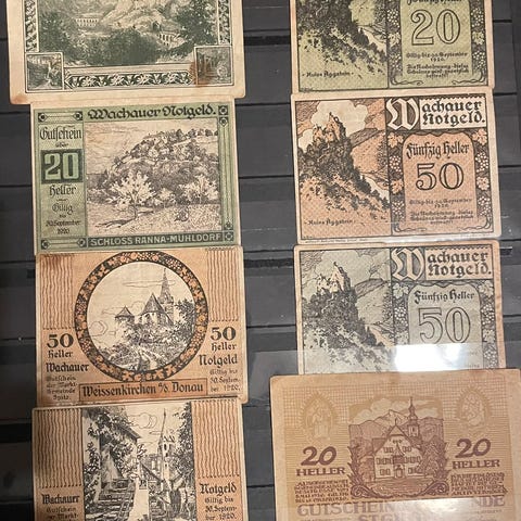 Sønderborg by nødpengesedler i papir. Samling med trykte sedler med motiver fra Sønderborg, herunder by- og bygningmotiver. Egnet til samlere af historiske pengesedler og lokalhistoriske effekter.