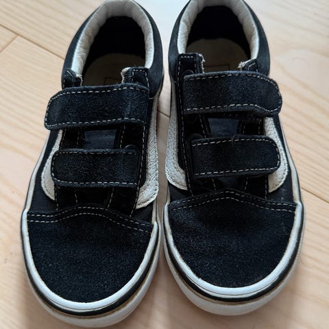 Str.21, Vans børnesko til den glitterglade pige! Vores pige havde desværre for store fødder. Skoene har glimmeroverflade i rosa og guldnuancer med hvid stribe på siden. De lukkes med to velcroremme over vristen. Ydersålen er den klassiske Vans gummisål med mønster for bedre greb. Velegnet som hverdagssko til mindre børn.