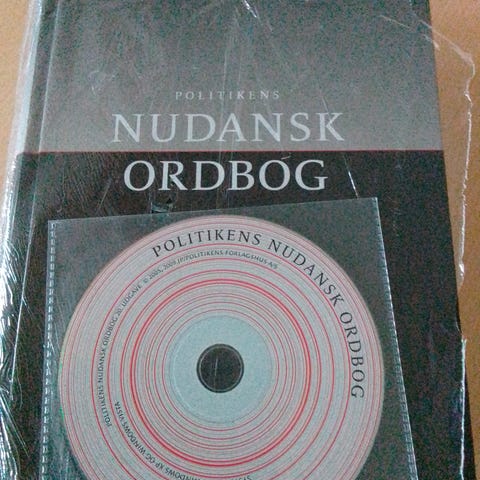 Politikens Nudansk ordbog bog. Dansk ordbog i bogform med rød og hvid forside. Indeholder forklaringer og stavemåder af moderne danske ord og udtryk. Velegnet som opslagsværk til skole, studie og arbejde, hvor der er behov for at slå danske ord og deres betydninger op.