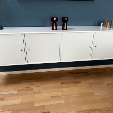 Mistral væghængt reol system i hvid. Brugt men fremstår super flot. Mål på overskabe og underskabe fremgår af tegning under billederne. Der er én hylde i hvert skab, jvf billede med åben låge.