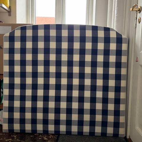 Hästens headboard in blue merino wool. The headboard is upholstered and padded and has a simple, rectangular design with straight edges. It has legs, so can simply be placed between the bed and wall. Suitable for a king bed (180cm wide) depending on the dimensions, which the buyer should check in relation to their own bed and wall.