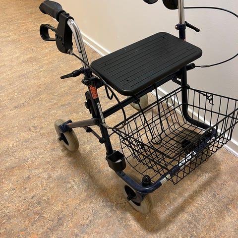 Rollator med underarmsstøtte i rød farve. Modellen har fire hjul, bremsehåndtag og polstrede underarmsstøtter for ekstra støtte ved gang. Der er integreret sæde og opbevaringstaske under sædet. Egnet som ganghjælpemiddel til voksne, der har behov for stabil støtte ved indendørs og eventuelt udendørs brug på jævnt underlag.