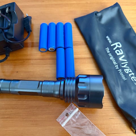 Ravfund.dk lygte med tilhørende Keeppower 26650 6000mAh high drain genopladeligt Li-ion batteri. Batteriet er på 3,7V og er egnet til brug i kraftige lygter og udstyr, der kræver høj strømlevering. Sættet består af lygten samt et Keeppower 26650 batteri og en batteriholder/hylster som vist på billederne.