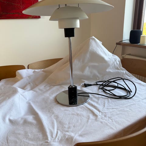 Poul Henningsen bordlampe med justerbar arm og hvid skærm. Lampen har en rund fod og en forkromet eller metalfarvet arm, der kan vippes og drejes, så lyset kan rettes efter behov. Skærmen er flerlaget og hvid, hvilket giver et blændfrit og jævnt lys nedad. Velegnet som arbejds- eller læselampe på bord eller skrivebord. Lampen tilsluttes med ledning og afbryder på ledningen eller ved fatningen, afhængigt af model. Passer ind i indretninger, hvor der ønskes klassisk belysningstegning af Poul Henningsen.