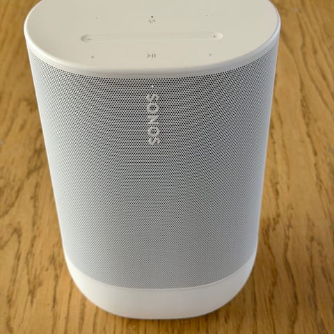 Sonos Move trådløs højttaler i sort. Bærbar højttaler med integrerede berøringsknapper på toppen. Egnet til brug i hjemmet eller på farten, og kan indgå i et Sonos multiroom-setup afhængigt af øvrigt udstyr. Designet i et kompakt, cylindrisk kabinet i mørk farve.