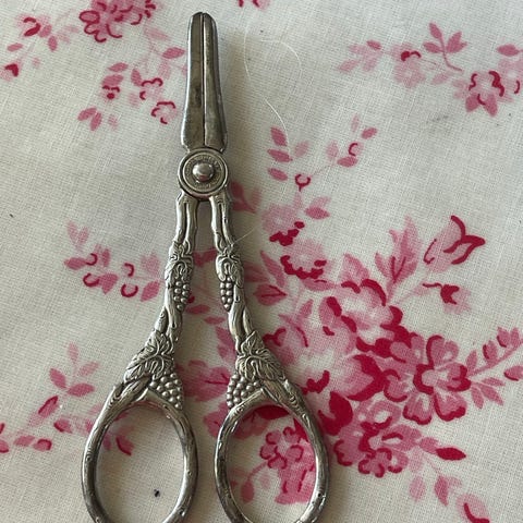 Dekorativ saks i sølvfarvet metal med mønstret greb. Saksen har et detaljeret, drueinspireret motiv ved fingergrebet og relativt korte, lige skær. Velegnet til lettere klippeopgaver som fx papir, tråd druereller små håndarbejder. Saksens størrelse fremgår af billederne, hvor den holdes i hånden for målestok. Kan hentes i Allerød eller sendes