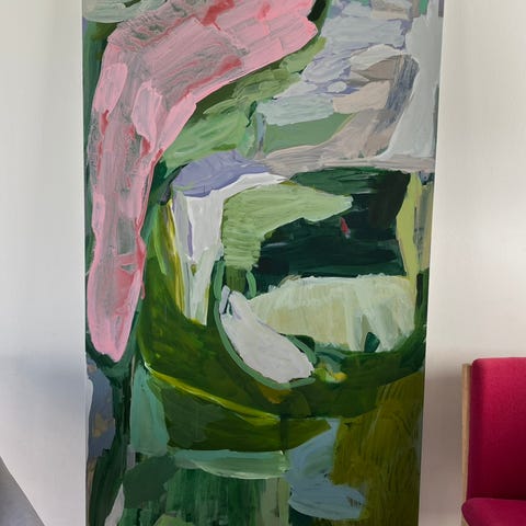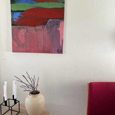 Abstrakt maleri, akryl på lærred, dansk kunst 70*90 cm. Blå, grønne og lyserøde nuancer.